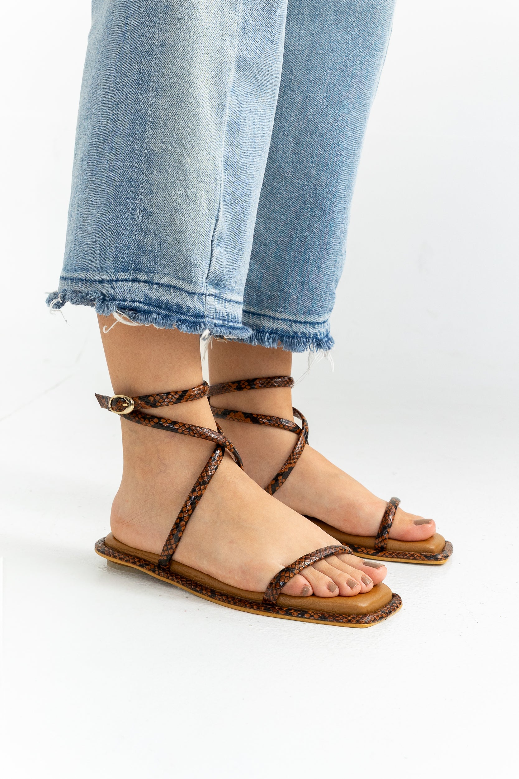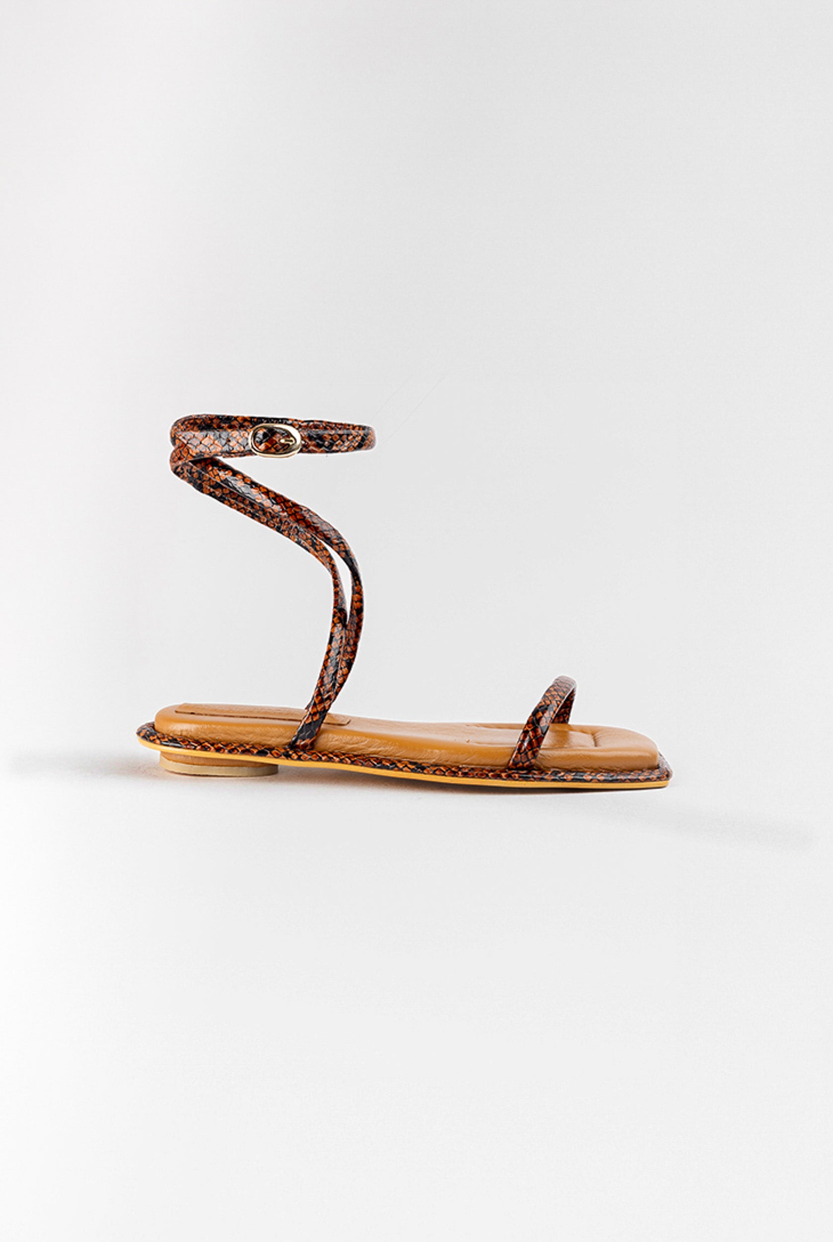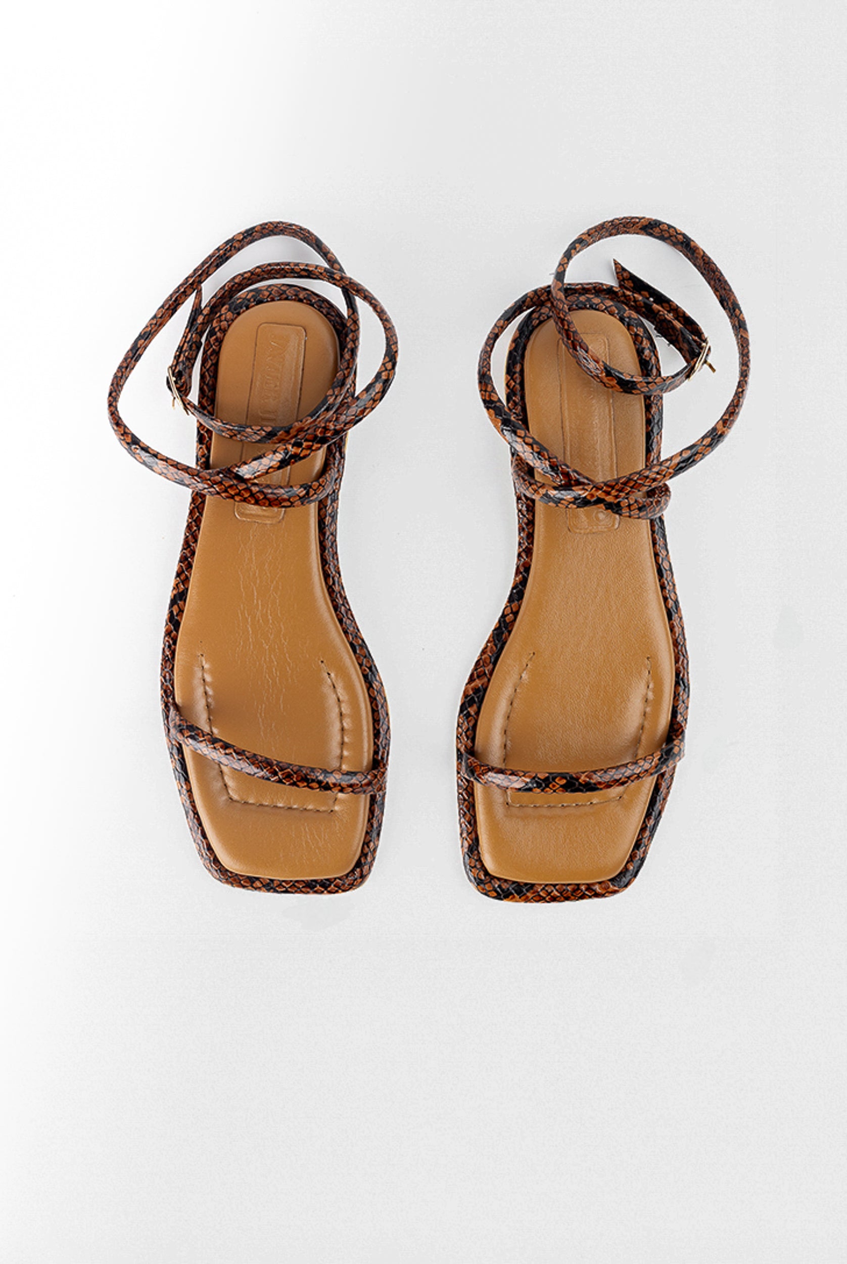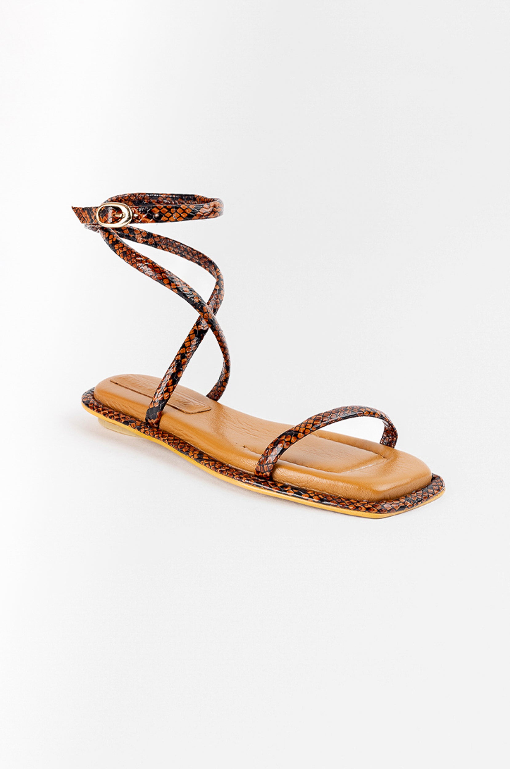 Sandalia plana que combina un tono Pitón con cuero bovino camel en su plantilla extra confort, Cerco abullonado slim forrado en cuero y costura decorativa en la plantilla. Altura de 5 milímetros.