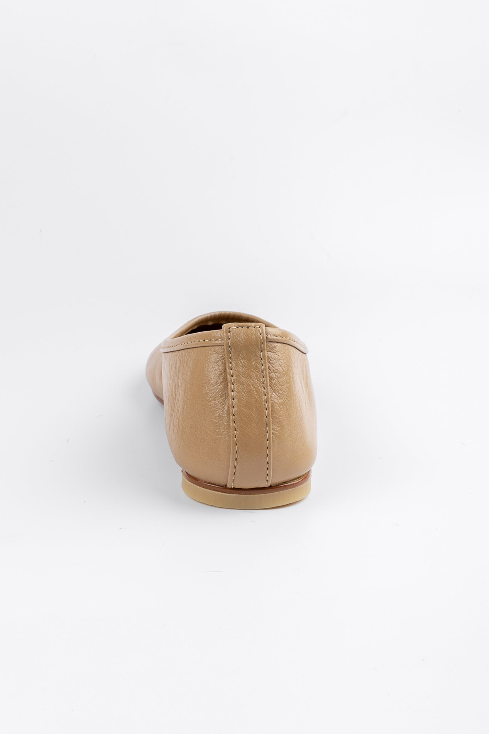 En tono arena, elaborada en cuero bovino tanto en su interior como en su exterior, se realza con un delicado ribete en cuero y descansa sobre una suela redonda, exclusiva, contraescaneada, rematada con una tapa tacón de 6 mm.