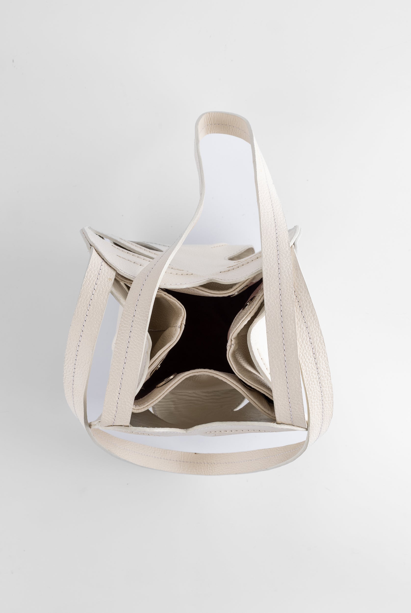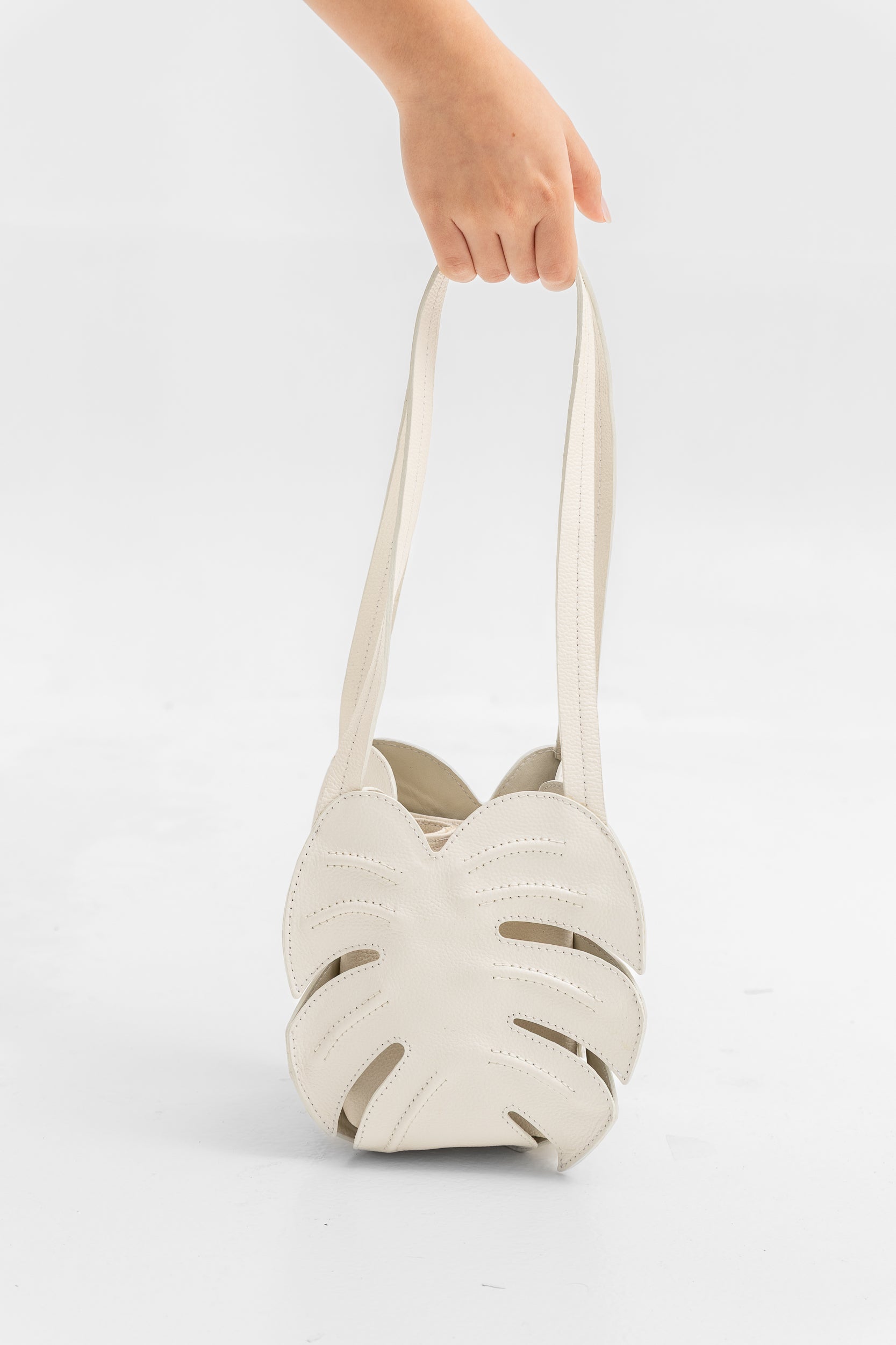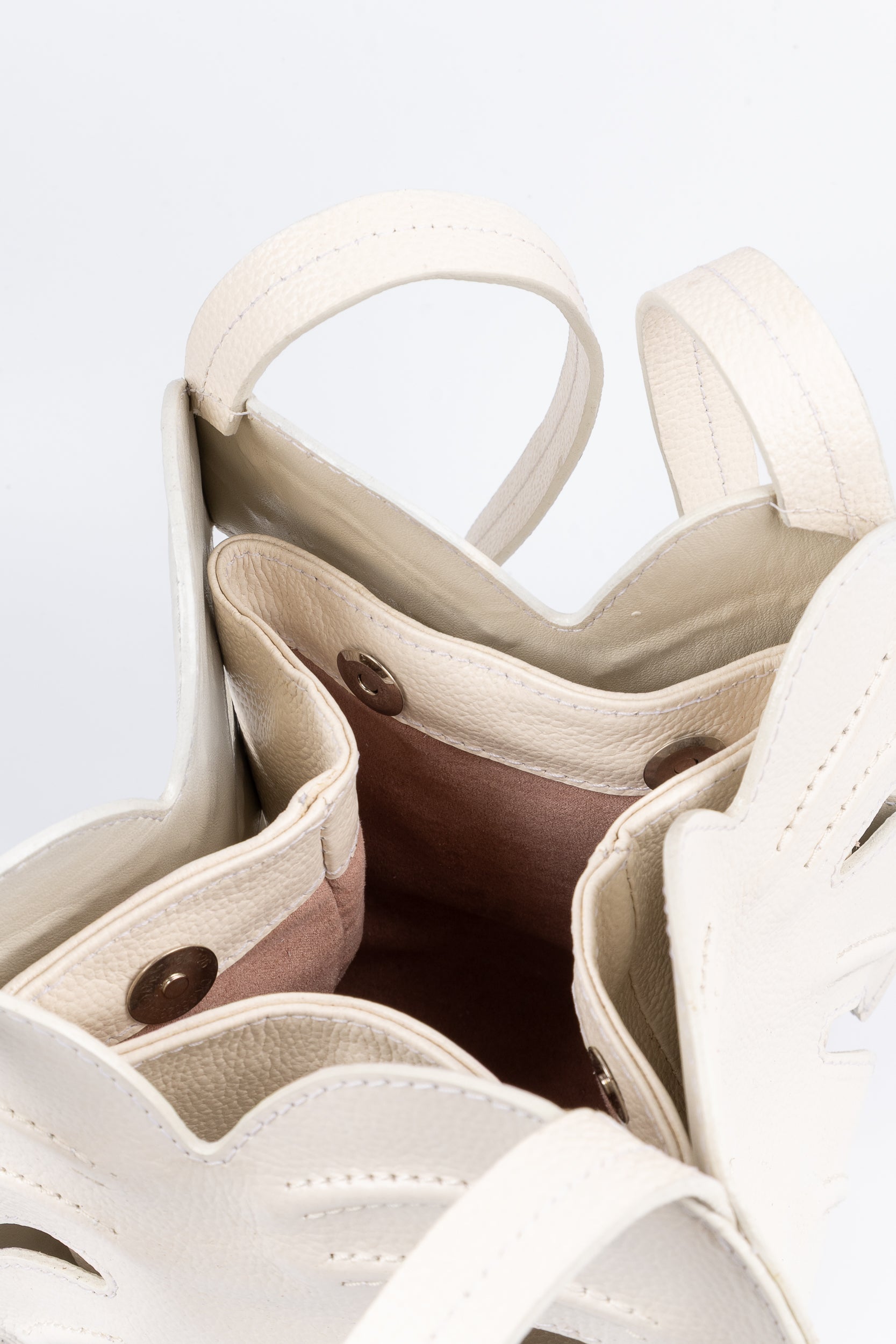Bolso mediano en cuero tradicional, en tono hueso, que reinterpreta la belleza exótica de la palma folclórica, playera y fresca. Su estructura se compone de cuatro hojas de palma, forradas internamente en cuero, con un delicado efecto abullonado que aporta volumen y realismo. Las cuatro piezas se unen formando una canasta escultórica y singular, pensada para acompañar días luminosos con un aire natural y sofisticado.