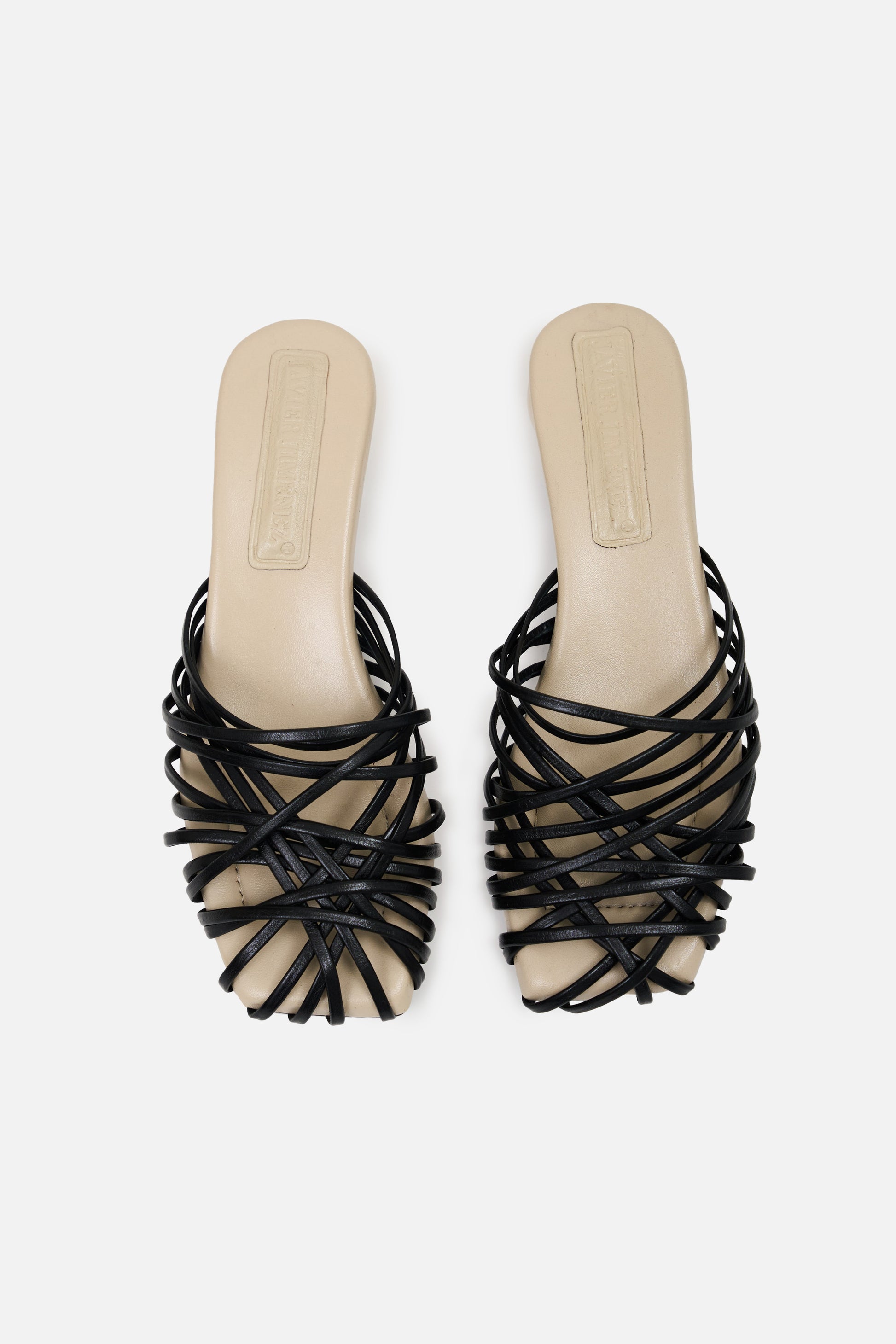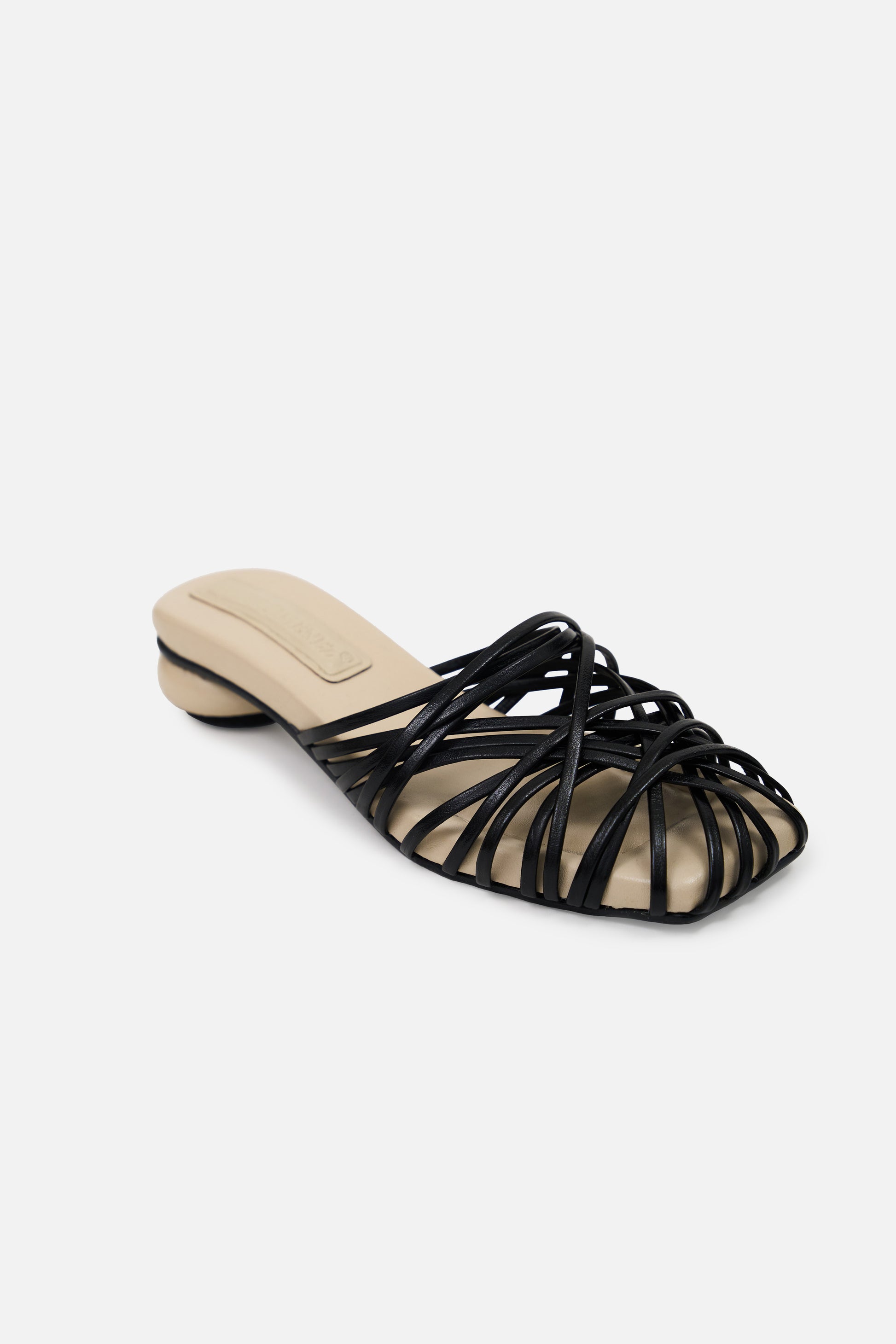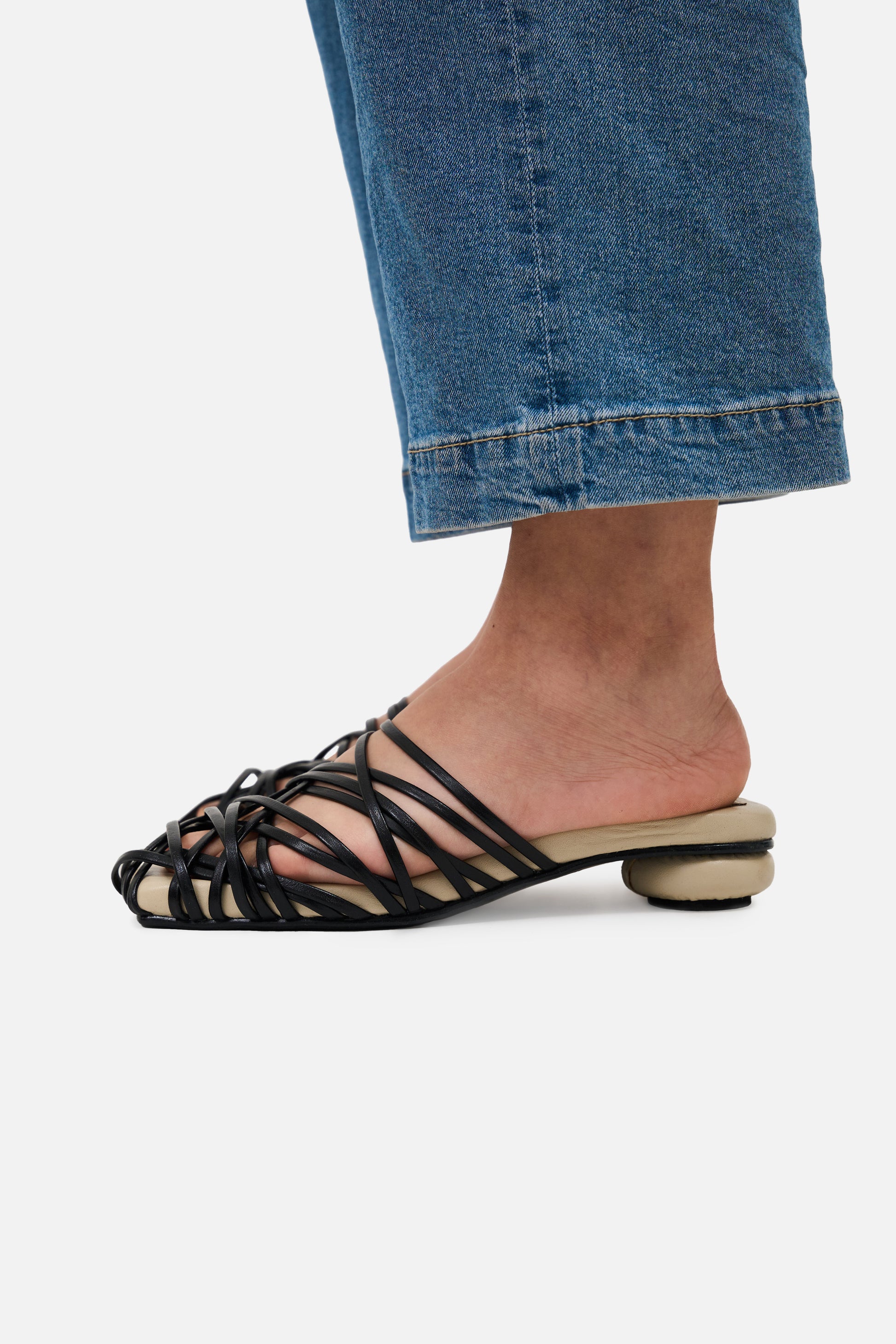 Una malla moderna, asimétrica y minimalista. Elaborada en cuero bovino extra suave, su tejido multiforme que estructura este diseño, con su plantilla acolchada acompañada de finas costuras decorativas y funcionales, su tacón en dona de altura 15 mm son el complemento perfecto para estar cómoda y sofisticada.