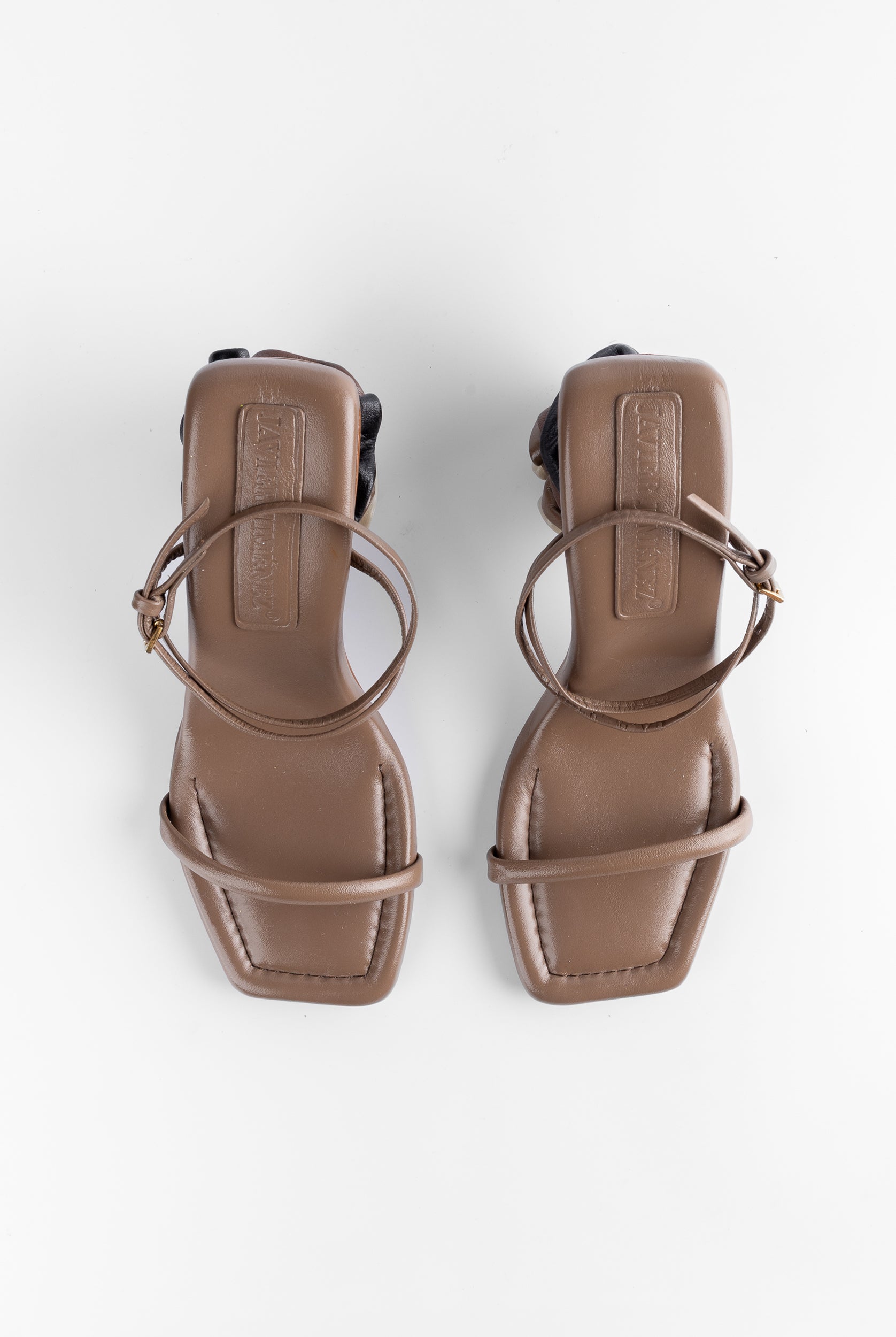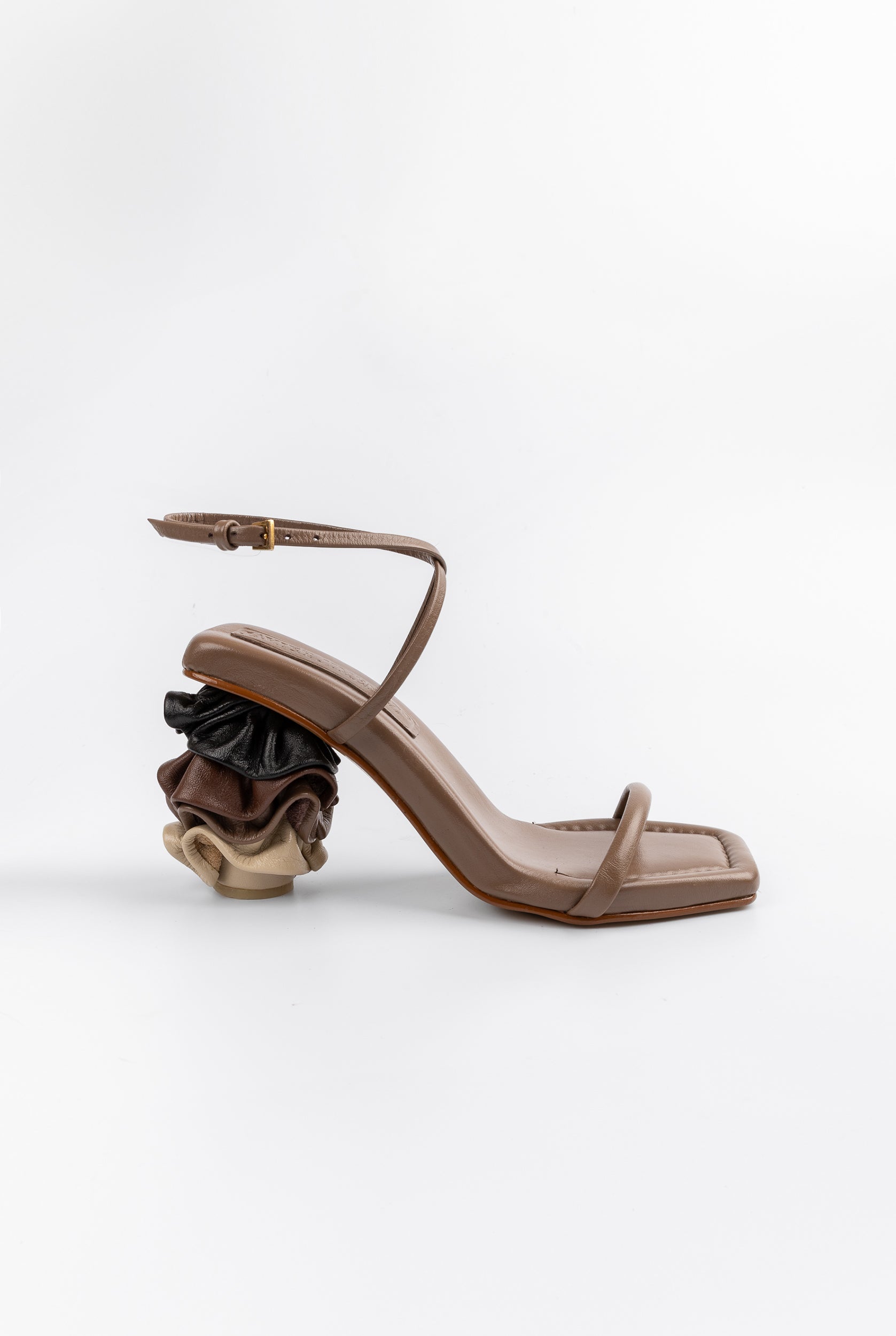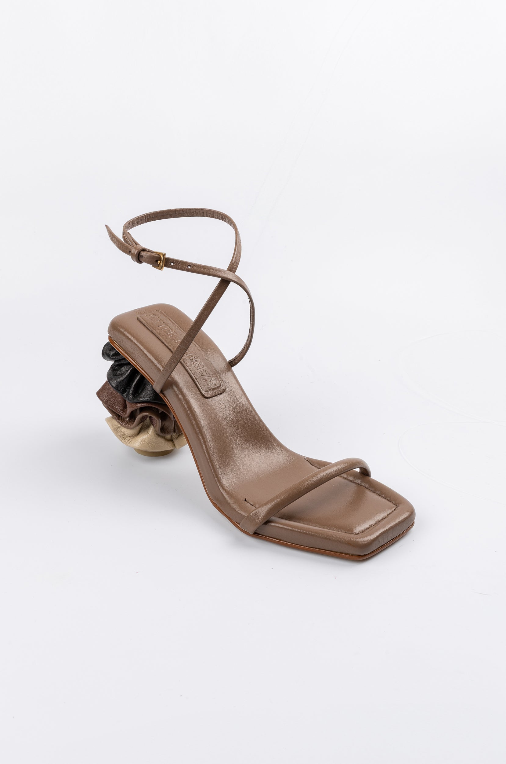 El manto de Rut es una sandalia de tacón que envuelve la esencia de la elegancia atemporal. Su diseño se eleva sobre un tacón cilíndrico, delicadamente contorneado por cuatro capas de golas artesanales, cada una con un arrugado único, creando un refinado degradé en tonos tierra. La capellada slim y el talón minimalista se equilibran con una plantilla cuadrada de costura decorativa, mientras la suela contramarcada sella su exclusividad. Una pieza que combina carácter, pulcritud y distinción, inspirada en la sofisticación de la mujer bíblica Rut y en la elegancia natural de quien la inspira en la vida real. Mi tía Rut y sus faldas únicas.