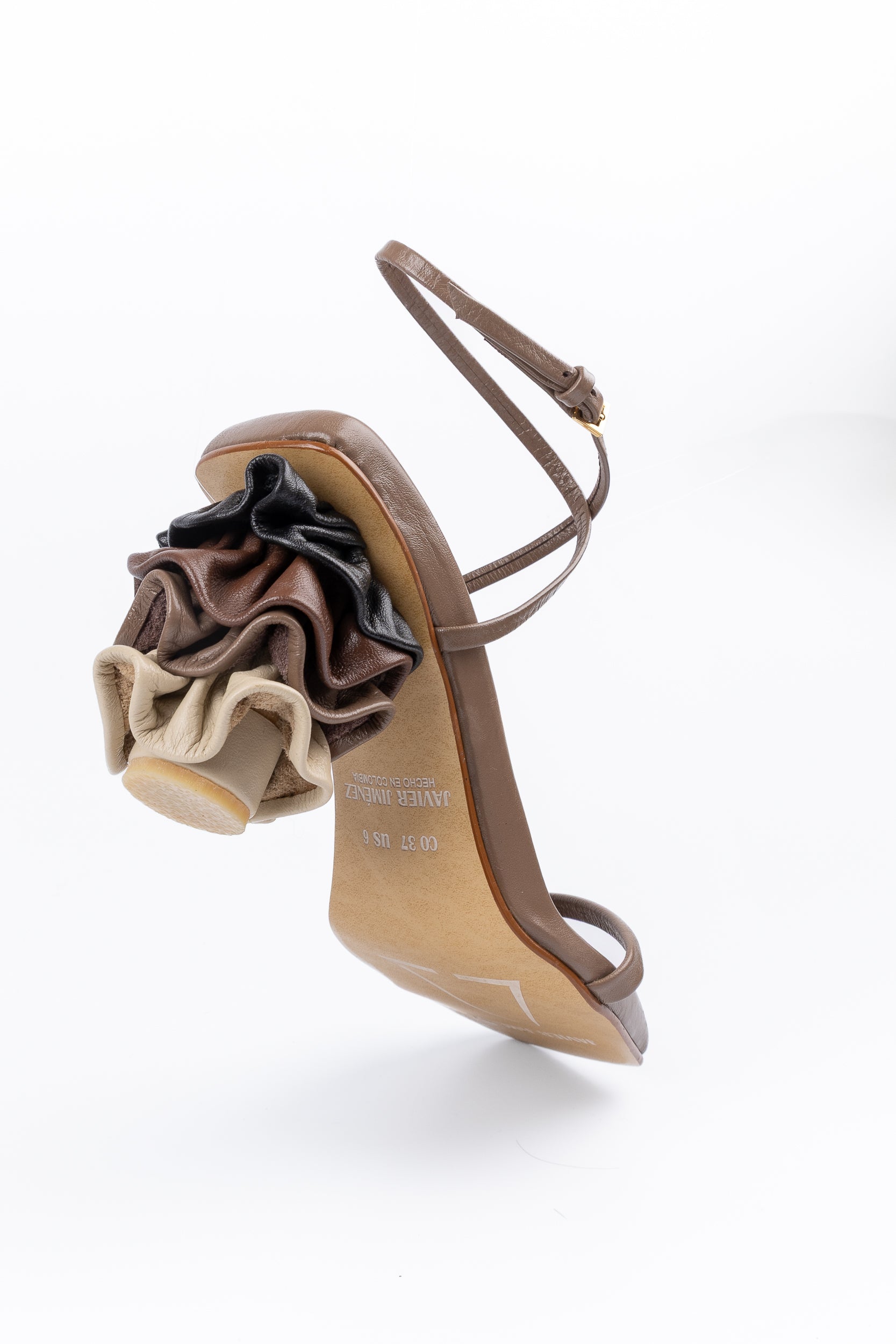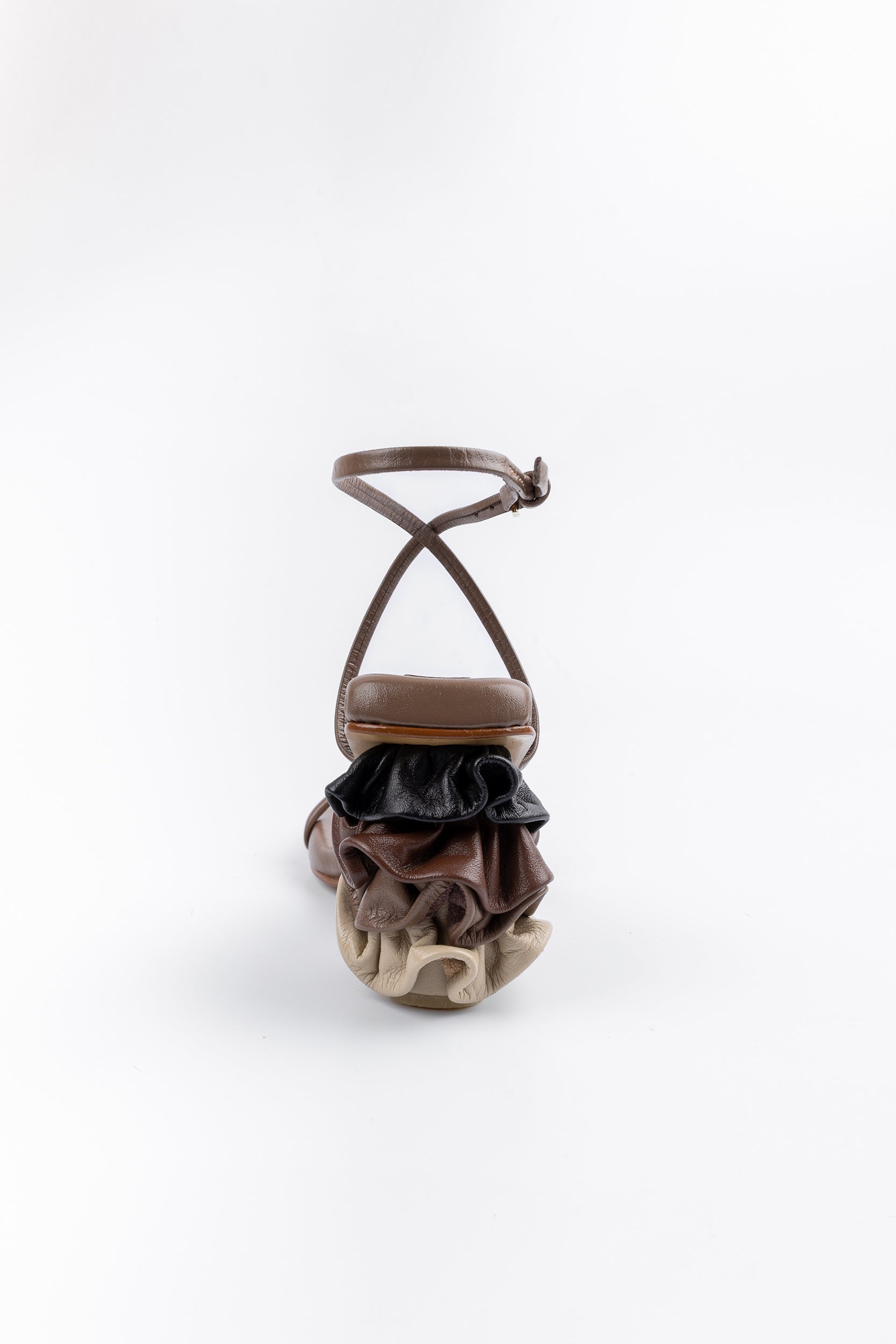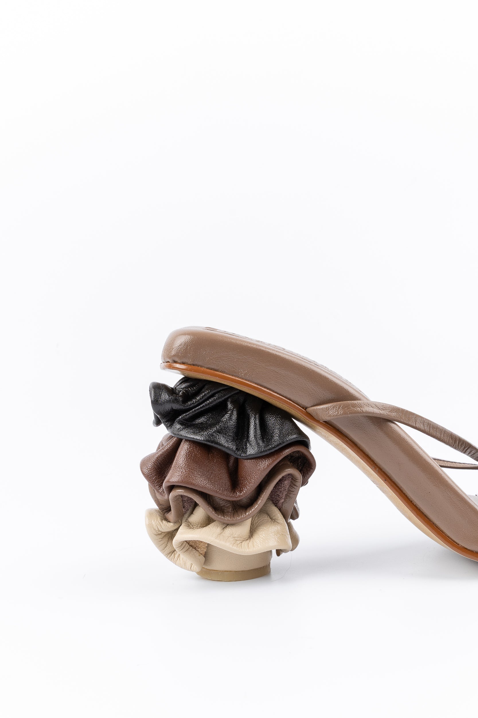 El manto de Rut es una sandalia de tacón que envuelve la esencia de la elegancia atemporal. Su diseño se eleva sobre un tacón cilíndrico, delicadamente contorneado por cuatro capas de golas artesanales, cada una con un arrugado único, creando un refinado degradé en tonos tierra. La capellada slim y el talón minimalista se equilibran con una plantilla cuadrada de costura decorativa, mientras la suela contramarcada sella su exclusividad. Una pieza que combina carácter, pulcritud y distinción, inspirada en la sofisticación de la mujer bíblica Rut y en la elegancia natural de quien la inspira en la vida real. Mi tía Rut y sus faldas únicas.