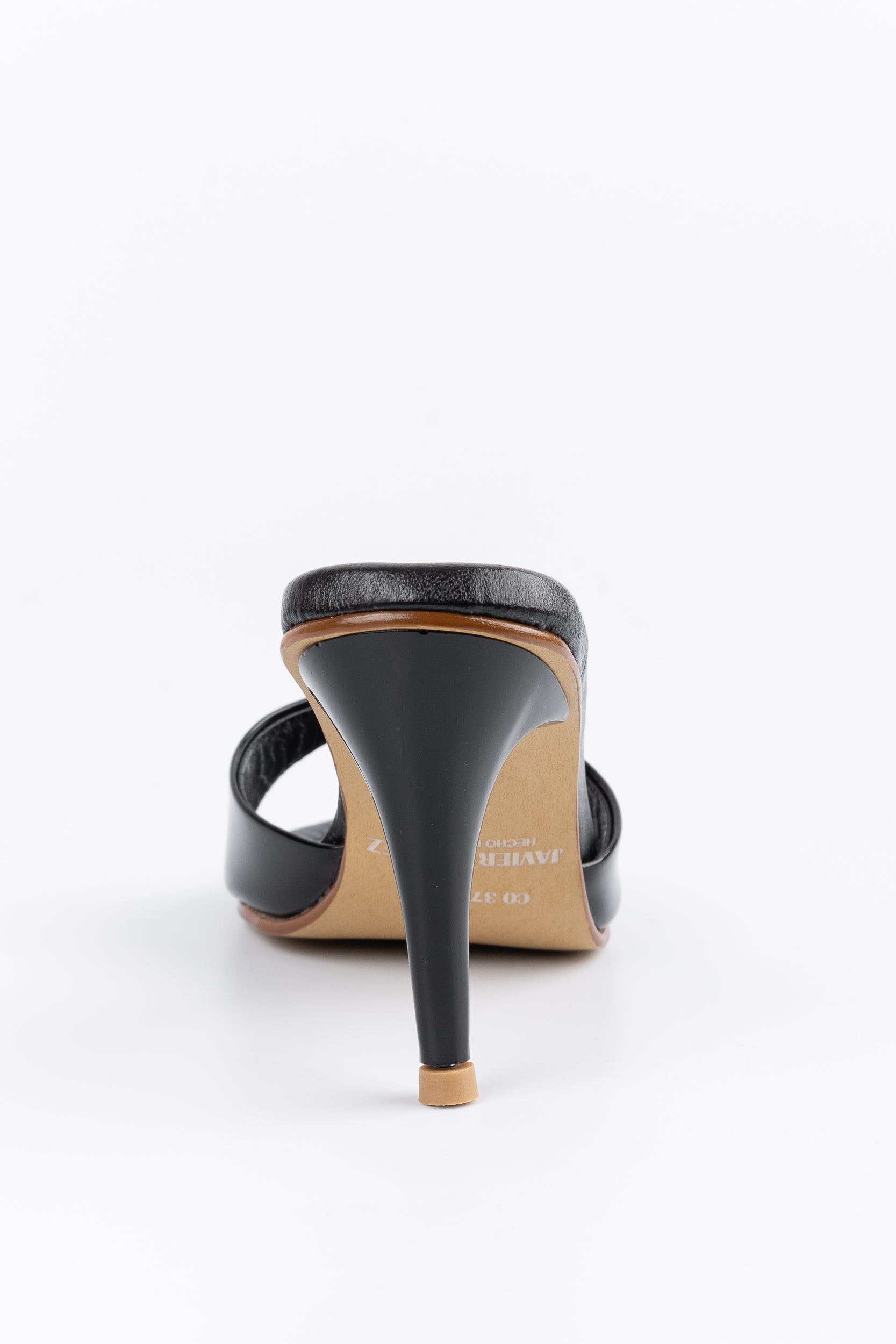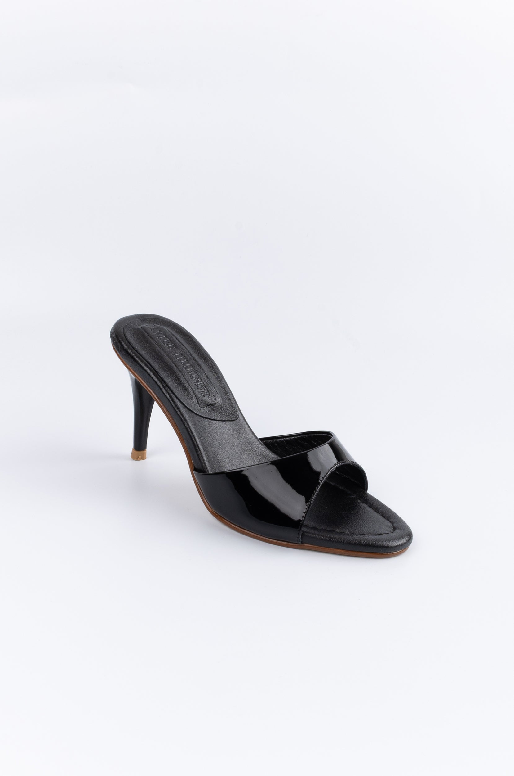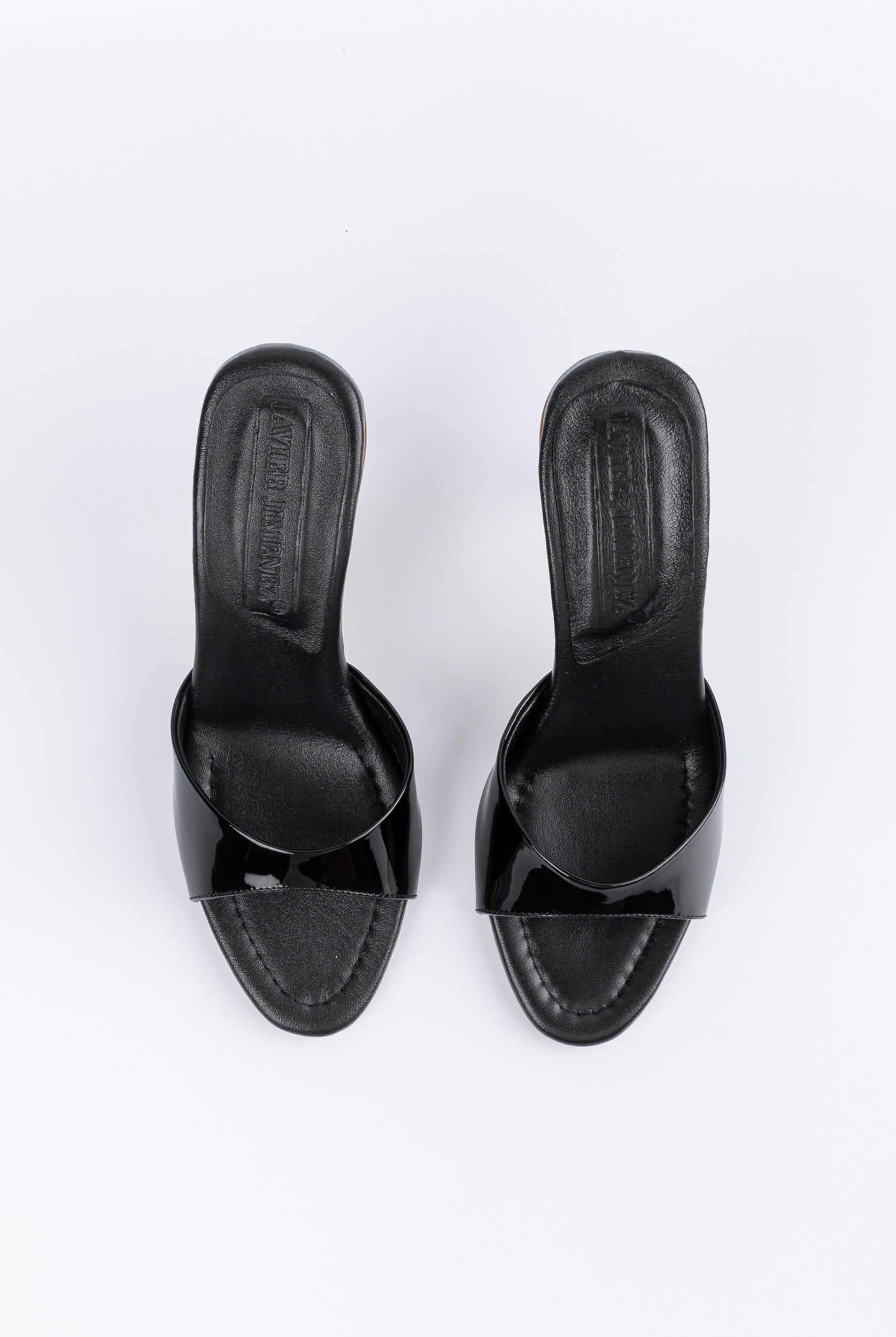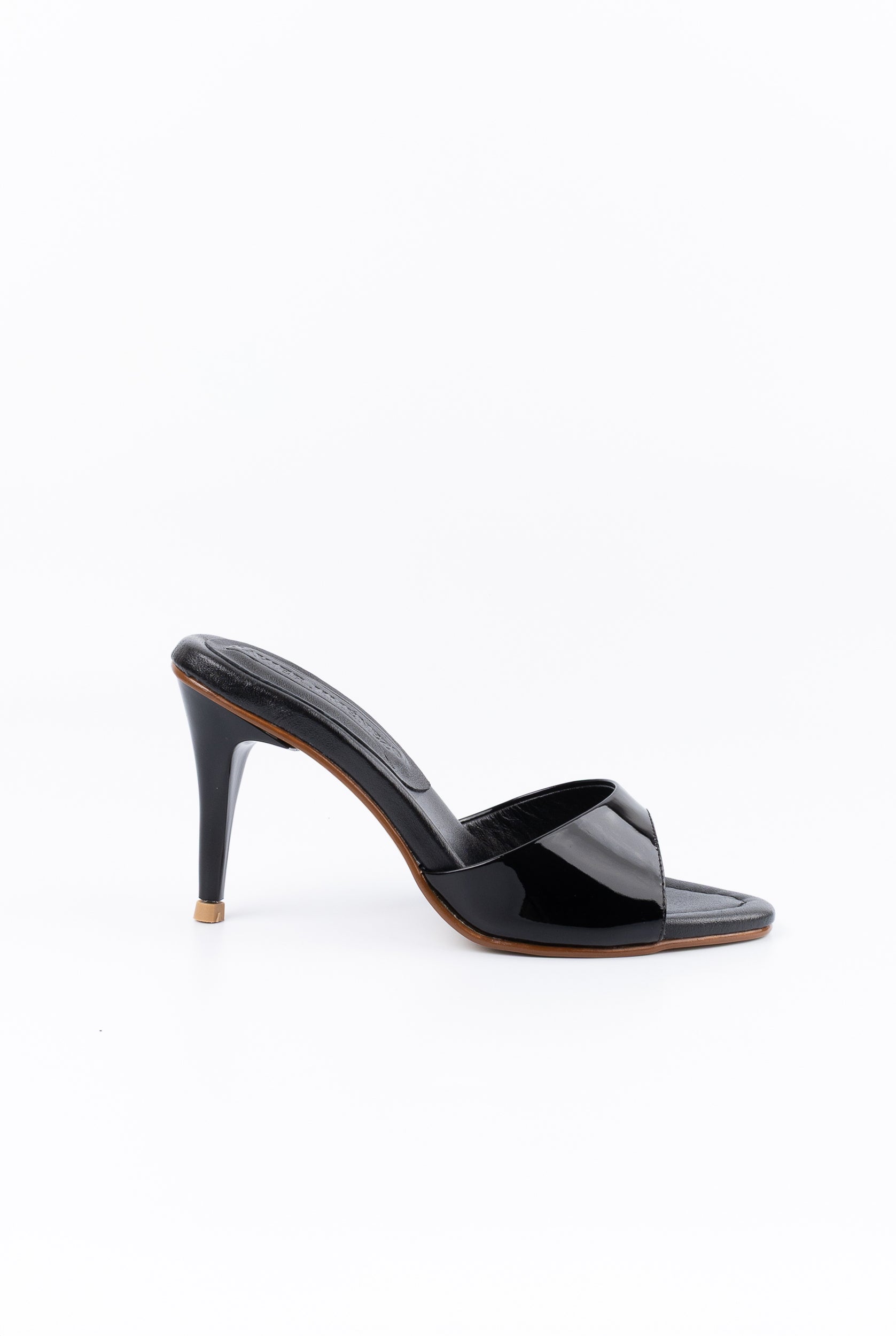 Sandalia clásica en charol negro, destalonada y de líneas limpias. Un diseño minimalista y elegante con tacón de 7.5 cm, creado para elevar lo esencial con sutileza.