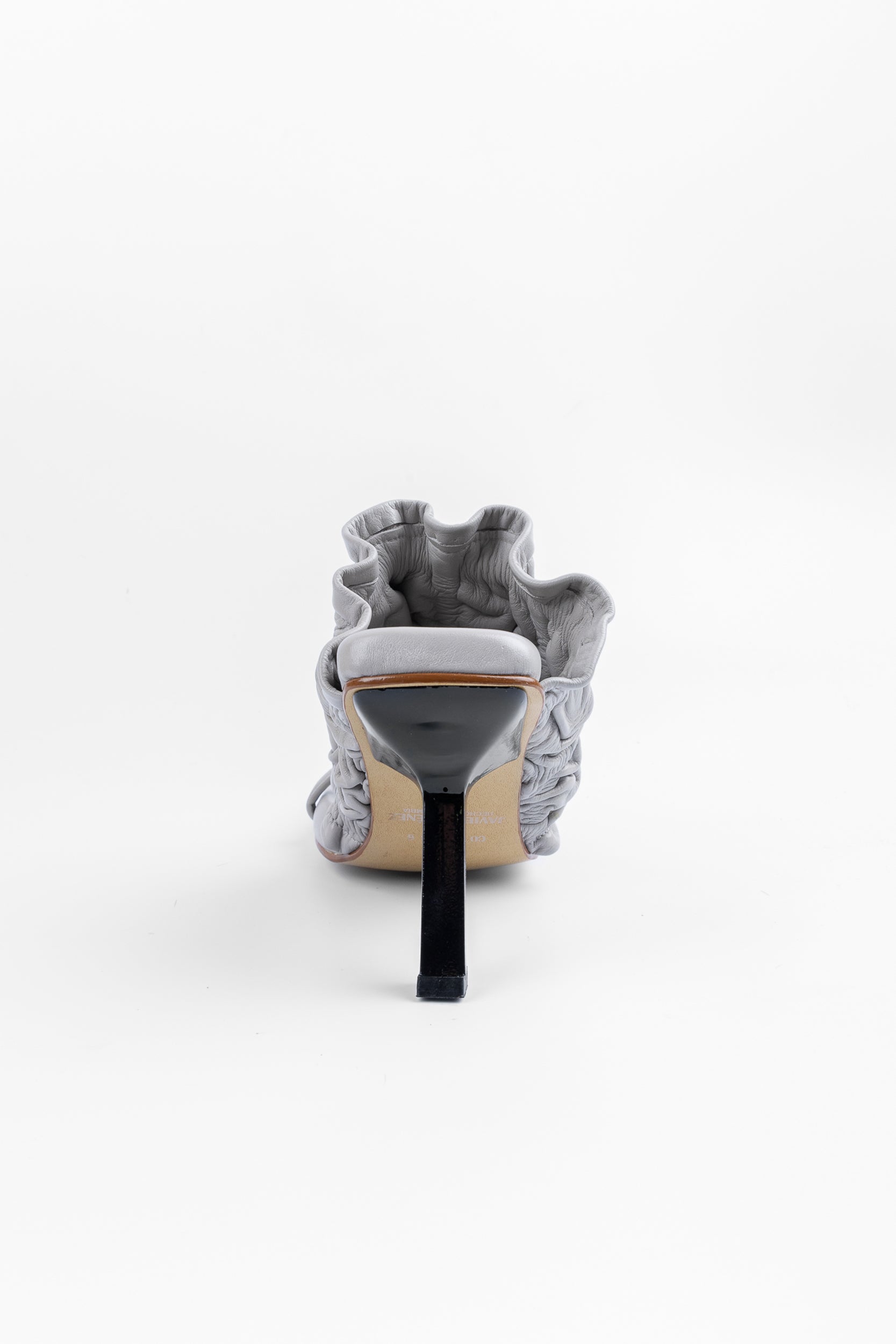 Sandalia de tacón de 75 mm en cuero bovino suave color gris, elaborada con la técnica flexy: un encauchado en forma de capellada ancha que conserva la cuadrícula original presentada en junio de 2025 como sello innovador de la colección. Esta técnica ligera y de movimiento combina piel y caucho interno para lograr un arrugado forzado de aspecto sofisticado y cómodo.