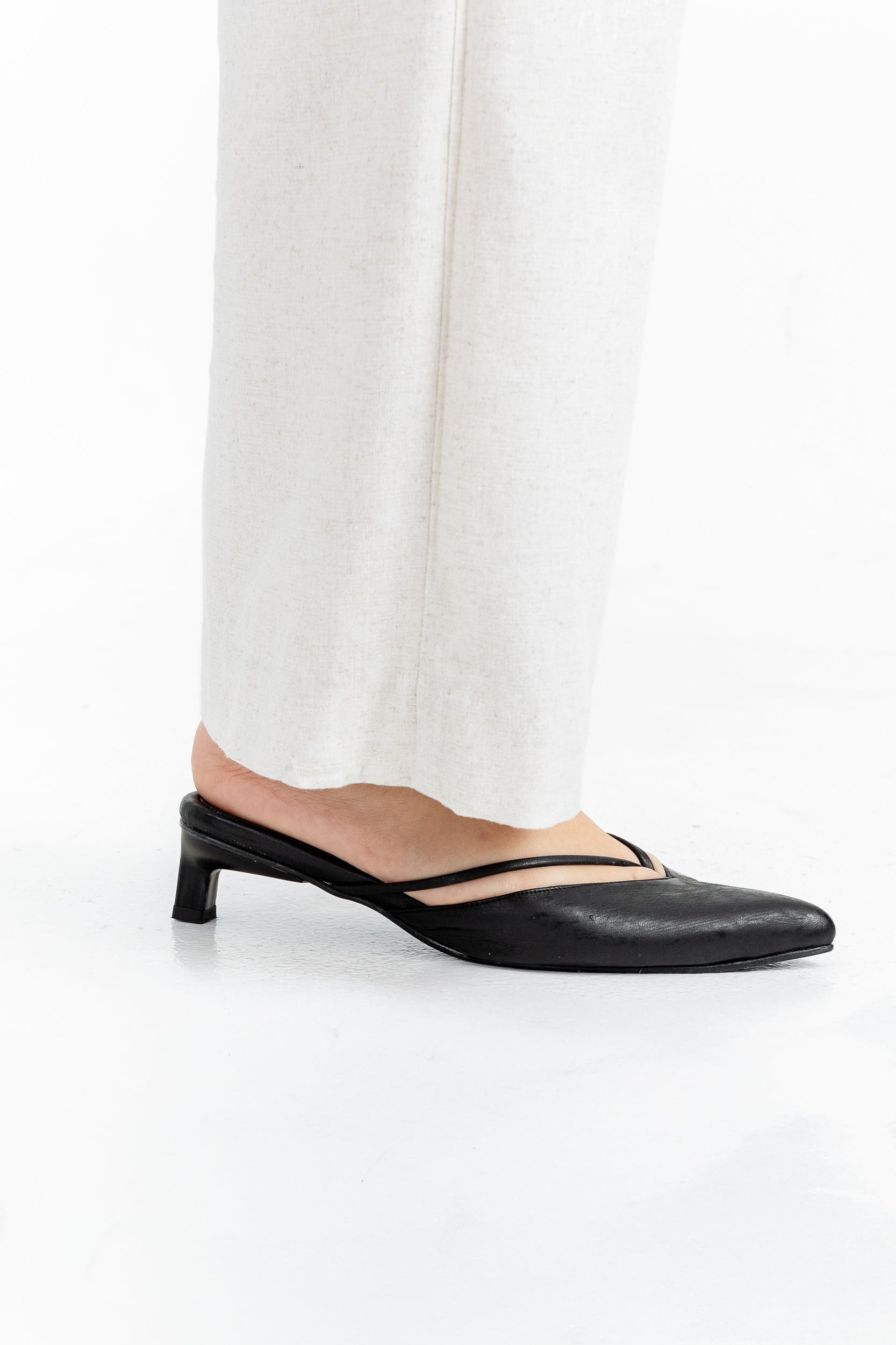 Un diseño puntiagudo con unas tres puntadas sutil e innovadora, huella santa Catalina y tacón simple en altura de 30 mm. Suela contra marcada.